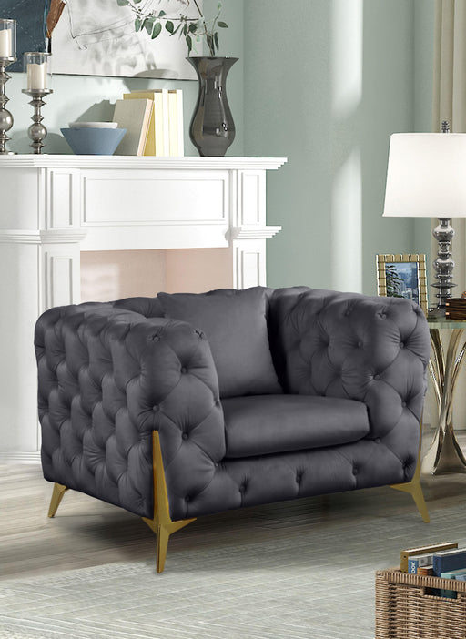 Kingdom Grey Velvet Loveseat - Soft Grey Velvet - Deep Button Tufting - Gold Metal Legs - Contemporary Design