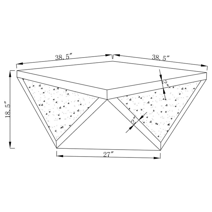 This mirrored coffee table set exudes modern luxury with bold, diamond-shaped designs. Including a coffee table and end table, both pieces feature triangular mirrored surfaces and glittery material for a glamorous touch. The square, reflective tops enhance their elegance, while the striking geometric bases make them perfect for adding a statement of opulence to contemporary interiors.