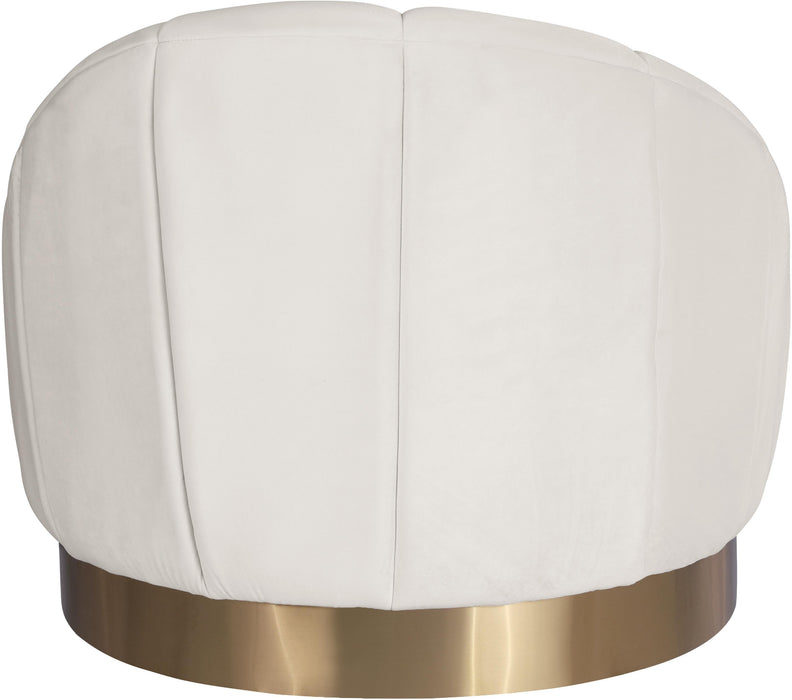 Unwind and rest whenyou'rere seated on this Shelly velvet chair featuring soft cream velvet upholstery. This lovely piece is just the thing to inject drama into your space whether used on its own or in combination with other items in the Shelly collection. The unique shell shape immediately commands attention, and the brushed gold stainless steel base cements the base in contemporary panache.