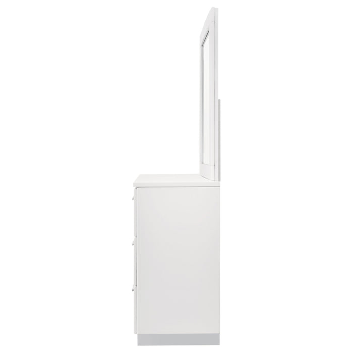 This dresser and mirror set brings streamlined function to contemporary bedrooms. The six-drawer dresser offers ample storage with smooth metal extension glides, while the mirror features a white high gloss frame that reflects light and complements the dresser’s modern silhouette. Chrome-finished handles and feet enhance the look with refined detail, making this set a practical yet stylish addition to your space.