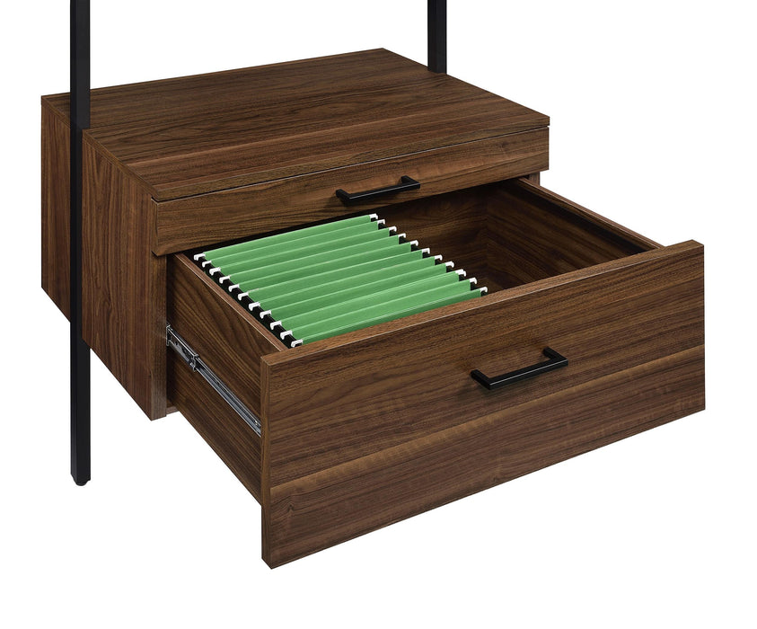 Play up the light, airy ambiance of a modern space while making use of every inch with a modern wall bookcase. It features four floating upper shelves and a lower case with two drawers, perfect for a blend of storage and display in any room. The shelves and two drawers feature a warm walnut finish over melamine paper, offering durability for a lovely look that lasts. A black finish metal frame supports the bookcase, offering neutral appeal in any setting. Stash essentials in the drawers while adding decor to shelves for a personal look and feel.