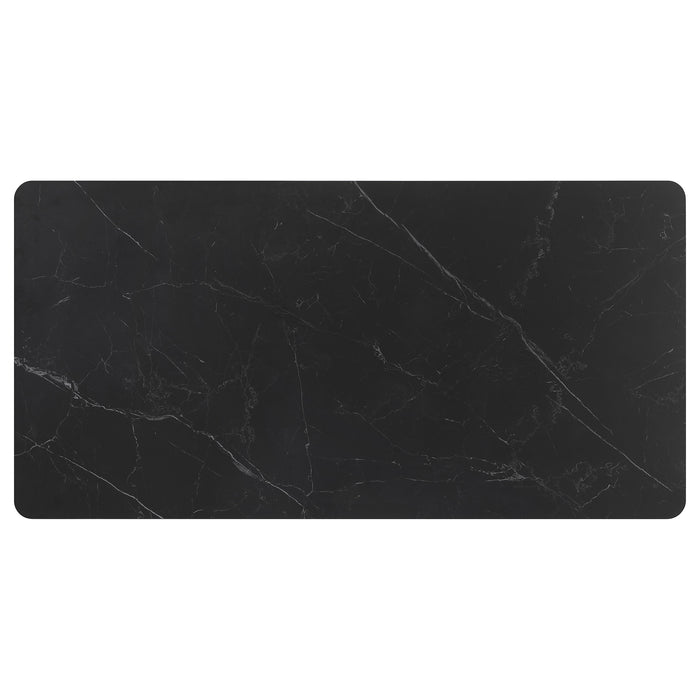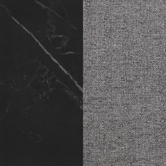Refresh the look and feel of a modern dining room with a contemporary seven-piece dining set in black and gray. Its rectangular table features a china ceramic finish tabletop with rounded corners for an inviting look. It stands on open frame U-shaped legs that splay for added angularity. Chairs are a comfortable and inviting design, complete with dimensional gray fabric upholstery. Rounded backs offer impressive comfort, while foam cushions ensure softness and inviting ambiance in a kitchen or dining room.