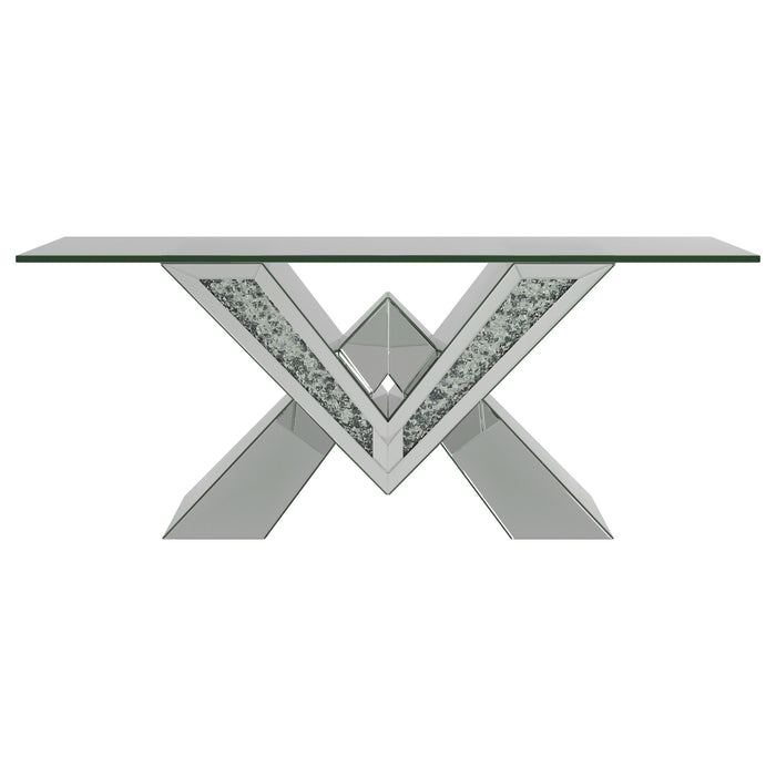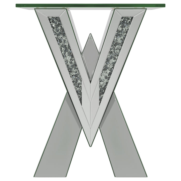 This mirrored coffee table set brings modern luxury to any living space. Featuring a coffee table and matching end table, both pieces boast bold V-shaped bases adorned with mirrored panels and glittering crystal accents. The coffee table’s rectangular glass top and the end table’s square top provide sleek, beveled tempered glass surfaces for added elegance. A perfect combination of glamour and functionality for contemporary interiors.