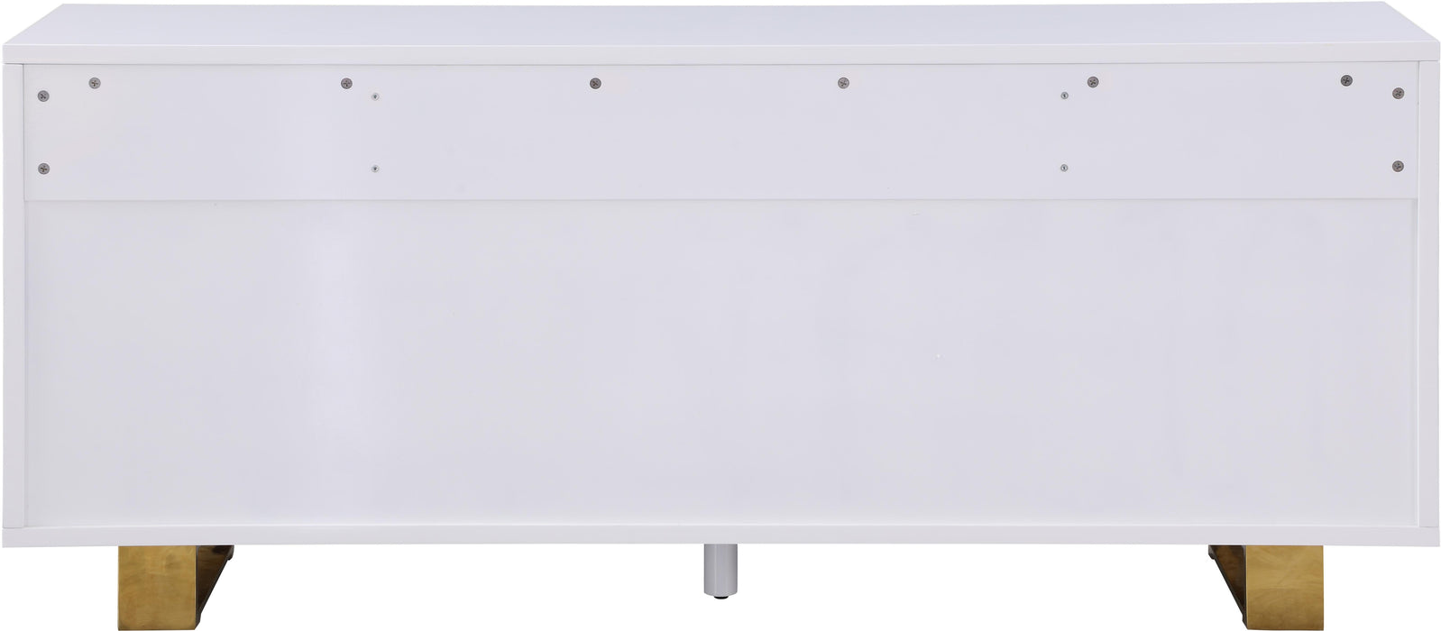Organize flatware and silverware in the three spacious drawers of this Excel sideboard buffet. This beefy sideboard offers room aplenty for holding things you need in the dining room���out of sight and out of mind. The rich white lacquer finish with gold base and handles gives this unit the modern panache needed to mesh with nearly any contemporary dining set. Wood and stainless steel construction ensures lasting beauty and long-lived performance.