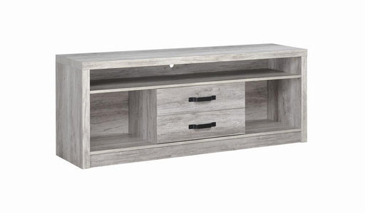Express your farmhouse style with this TV stand. Its wispy white finish over replicated oak wood grain is a delightful change from the ordinary. Cl...