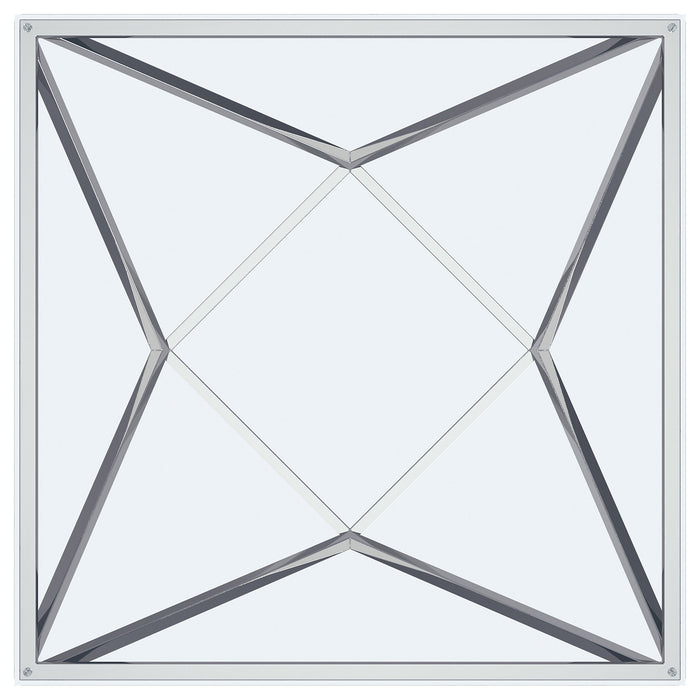 Simple geometric shapes combine to form a strikingly modern end table. The design features open, flared triangles in metal with a gleaming nickel finish, creating a dynamic base. A square glass top offers a smooth, airy surface, perfect for displaying decor or serving cocktails. The square base, rotated to form a diamond, adds an unexpected artistic touch. Perfect for a foyer or as a chic accent in a contemporary seating area, this table enhances any space with elegance and modern style.