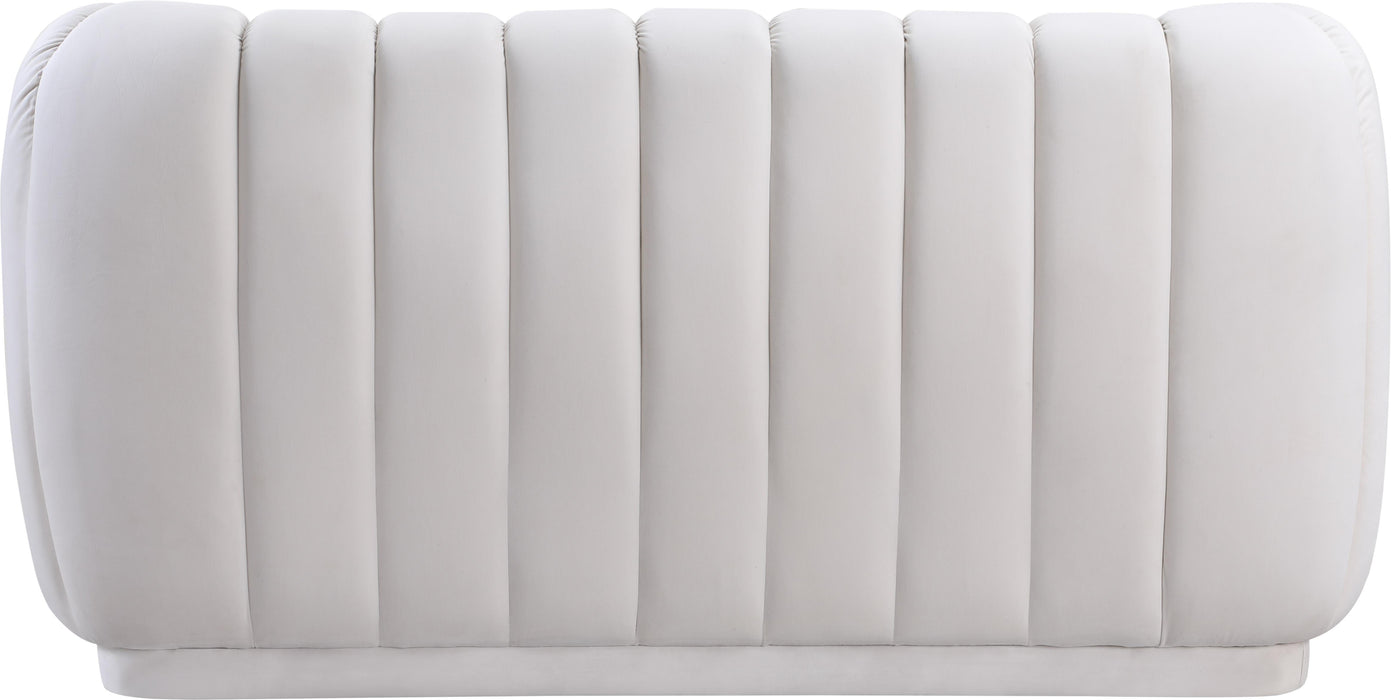 Casual meets elegant in the design of this Dixie velvet love seat. Relax, unwind, and take a load off whileyou'rere kicked back in this handsome seating option. Deep channel tufting adds an upscale touch to the unit���s soft cream velvet upholstery while giving it a dimensional look. Pair this piece with other items in the Dixie collection for a complete and seamless look in the living room or den.