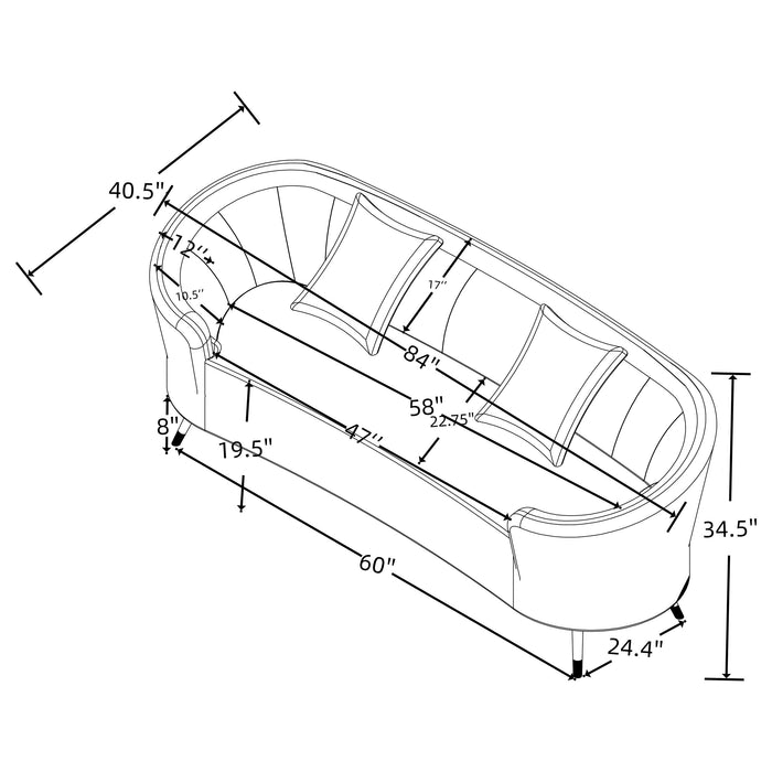 The gentle curvature of a kidney silhouette brings graceful energy to this two-piece modern sofa set. A smooth bench seat is complemented with a channel tufted back in both the sofa and loveseat, creating stylish ambiance and comfortable seating. Soft beige upholstery fabric sets the tone, while accent pillows add flexible comfort and inviting ambiance. The set shows off a tailored profile, complete with a shelter back and sloping arms. Each piece stands on slender, tapered legs in a black finish, offering a touch of contrast and depth in your living room.