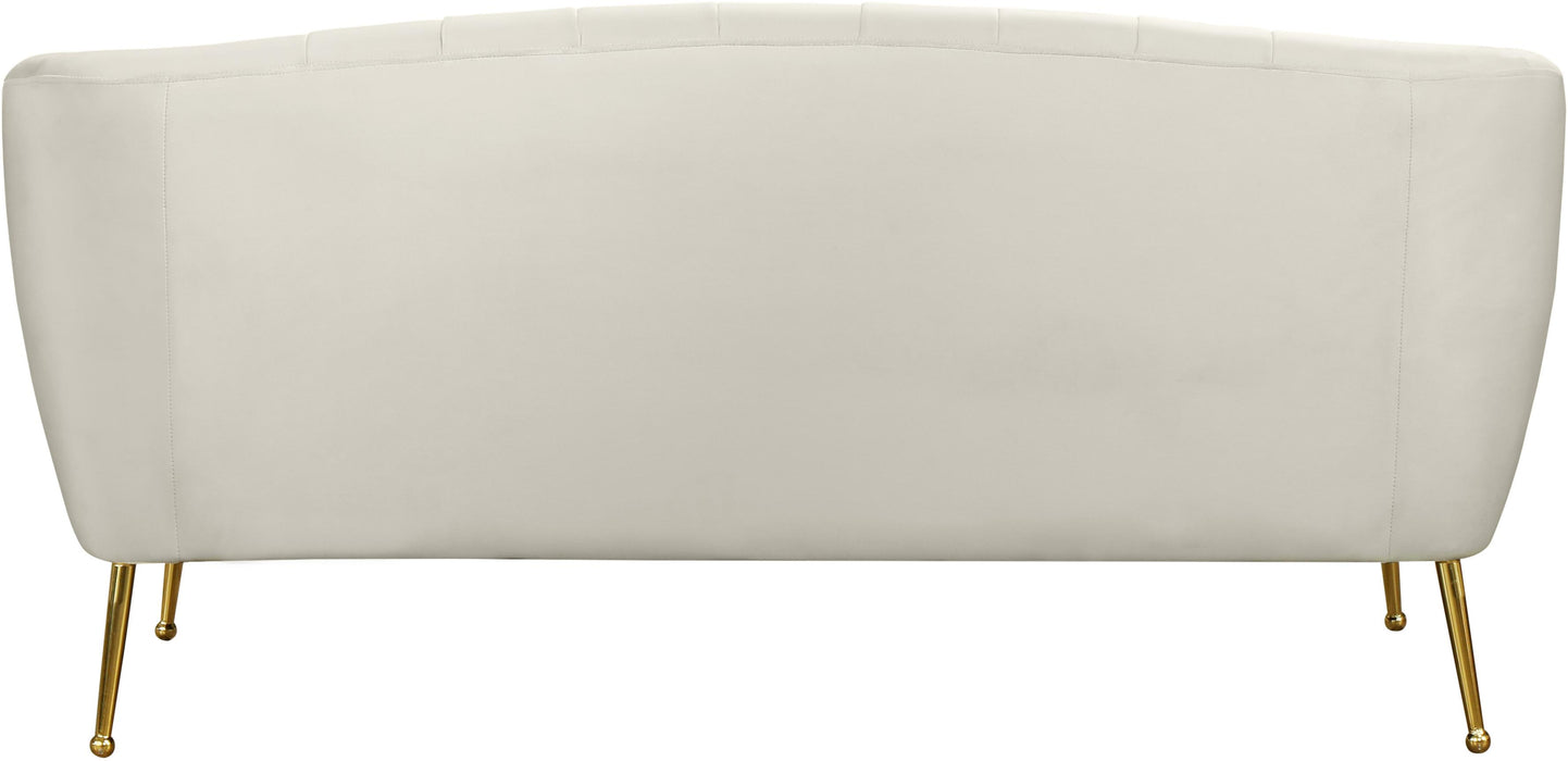 Dress up your living room space with this Tori Velvet Loveseat. This plush loveseat features chic cream velvet upholstery that covers every square inch, adding a sumptuous and svelte look to your room. The gold legs with a ball design on the foot adds to the elegant look of this pretty chair, and deep channel tufting adds loft to the back and arms for a lavish feel when you sit down to relax and unwind at day���s end.