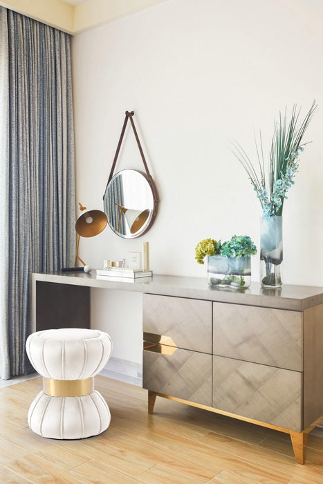 Add modern sophistication to your living space with this chic cream velvet Vino ottoman stool. Plush cream velvet curves are bound by a gold stainless steel band in its center, creating an hourglass shape that is edgy and complements your contemporary home decor. Place this lush ottoman stool next to your vanity in your bedroom, so you?��Ǩ�Ѣll have a comfy place to sit while you do your hair and put on your makeup.
