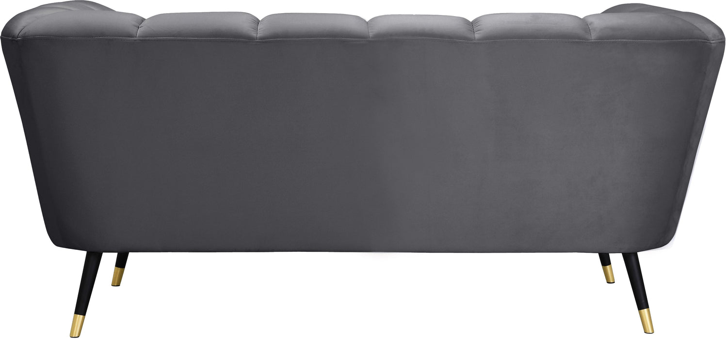 Sink your body into the inviting comfort of this Beaumont velvet love seat. Upholstered in a soft shade of grey with black metal legs tipped in gold, this chair oozes modern charm and up-to-the-minute comfort. The heavily stuffed arms, seat and back are bound to beckon at day���s end for you to sit and relax. Deep channel tufting on the back and arms adds to its uber welcoming look. Pair it with the matching pieces in the same collection for cohesive beauty.