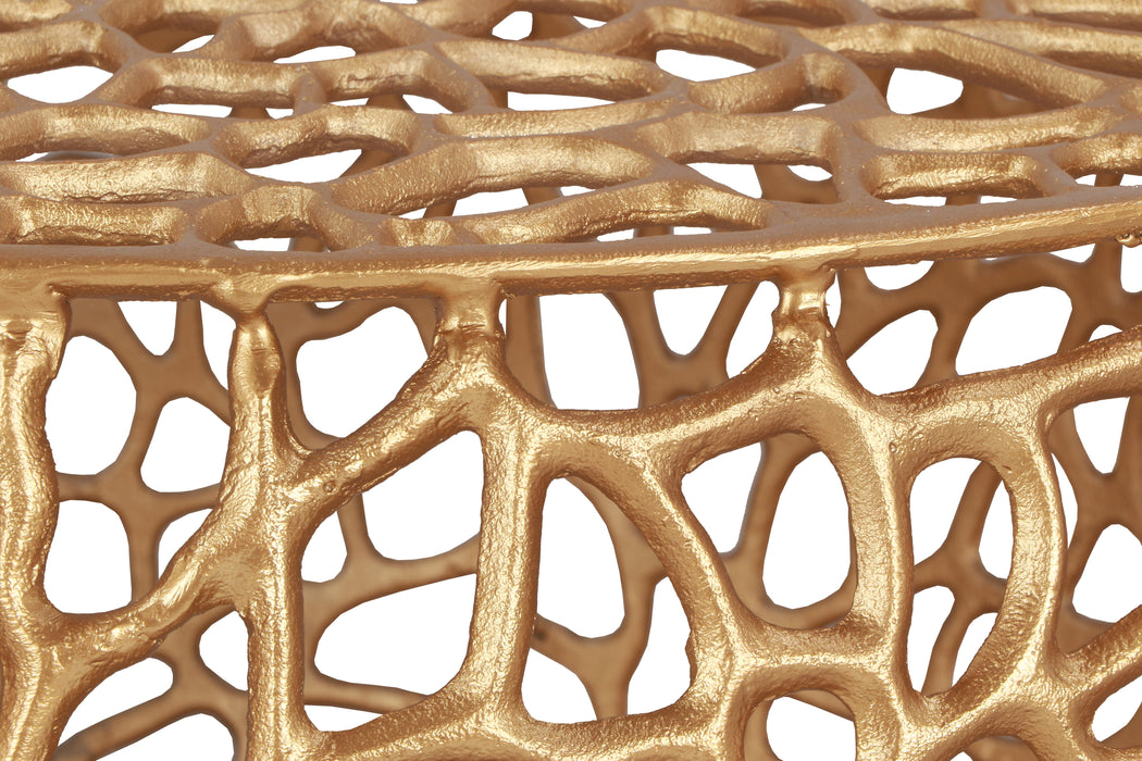 Give your space that added wow factor with this handsomely modern Priya coffee table. This contemporary table is made from solid aluminum for a lasting, durable build that holds up to years of use. The strikingly intricate detailed scrollwork and attractive gold finish gives it a sleek and modish vibe that is well at home in your living room or den. Pair it with the coordinating end table for a coordinated look in your room.