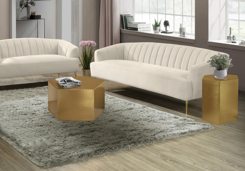 Customize your modern space with the easy style of this Hexagon modular coffee table in brushed gold. Use one table on its own for a handy and stylish spot to hold your drinks or display a framed photo, or add multiple tables together to create even more space for entertaining or playing cards or board games. This metal table is completely customizable to your needs and features a bold hexagon shape for a modish feel.