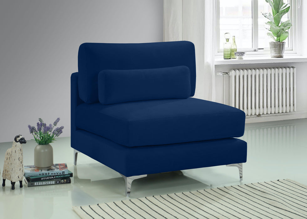Ready to get cozy? Curl up from the welcoming confines of this Julia velvet modular armless chair and you can do just that! Its soft navy velvet upholstery is soft and supple to the skin, coaxing you to relax, unwind, and sit for a spell. It comes with both gold and chrome legs for a customizable and contemporary finish. Pair this Julia piece with others to form an infinite number of seating configurations to meet your particular decorative desires and space requirements.