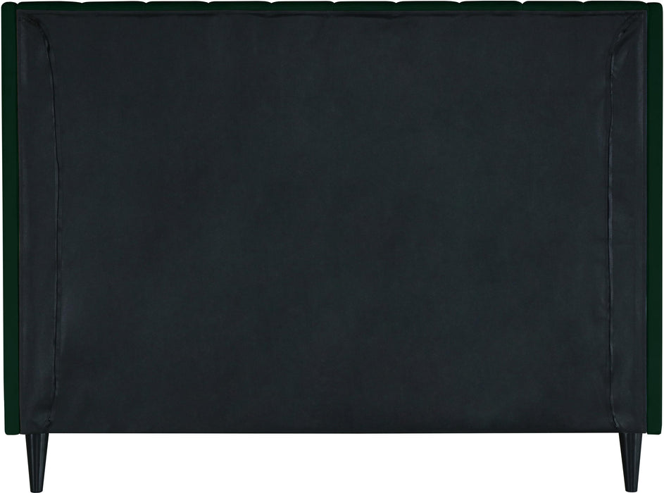 Snuggle up to a pet or other loved one in this richly upholstered Eva green velvet full size bed for the ultimate in rest and relaxation. The wing back headboard has cushioned vertical deep channel tufting, and both the side rails and footboard are upholstered too for your comfort. Tapered black wood legs match the upholstery and support this contemporary bed, elevating it sufficiently that you can store items underneath.