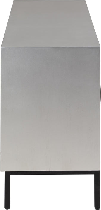 Set up a makeshift dessert bar atop this Glitz sideboard buffet. This handsome piece is just what your dining room needs to inject a bit of drama into the mix and liven things up a bit. This piece features wood construction for lasting durability and beauty and an antique silver finish with a matte black base for a contemporary touch. The starburst pattern adds a burst of wow to the design and ensures the buffet, and storage inside helps you organize all your dinnerware and serving pieces.