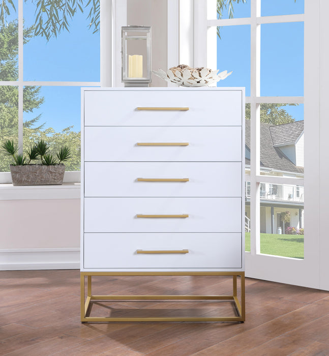 Outfit your space with this Maxine chest, part of the Maxine collection of contemporary bedroom furniture. This lovely chest features a rich white finish over birch veneer construction for durability, strength, and resilience, and it���s equipped with brushed gold metal legs and hardware for a simplistic yet elegant finish. Pair this item with other bedroom essentials in the same collection for a beautiful look in your room.