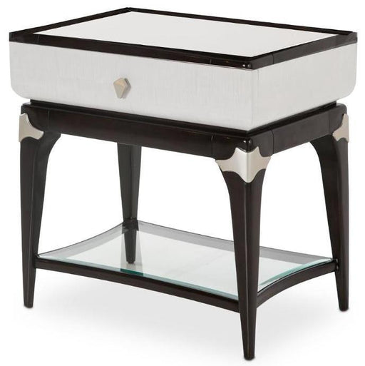 Roxbury Park Collection by AICO Furniture Stainless Steel finish Nightstand features wood frames with Figured Ash Veneer and a Slate Finish Drawe...