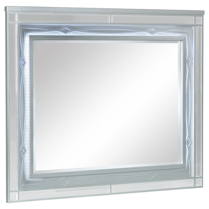 This contemporary 4-piece bedroom set featuring a bed, nightstand, dresser, and mirror imparts a glamorous look and feel to any modern home. Each piece of this exclusive Coaster design comes in a shimmering silver metallic finish that enlivens any space. The imposing bed headboard is upholstered with metallic leatherette that's fully tufted with crystal buttons. The headboard and mirror include white LED touch lighting for a vibrant ambiance, while the nightstand features USB ports. The drawers on each case good are crafted with fret work detail on the front panels and crystal-like pulls, with top drawers lined with black felt to protect your valuables.
