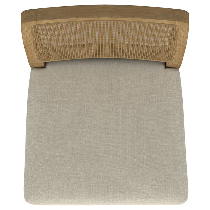 This dining chair combines modern comfort with organic charm, featuring a handwoven cane backrest crafted in Indonesia for a natural, textured appeal. The solid Asian hardwood frame provides durability and a warm aesthetic, while a beige linen-like upholstered cushion enhances its cozy style. Pirelli webbed seat construction ensures both comfort and lasting support. Reinforced with a sleek metal stretcher bar, this chair balances beauty and functionality.