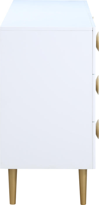 Watch your d?�cor cascade to new heights when you bring home this Zayne dresser. It features a rich white finish that sets an instant contemporary vibe in your space. Its brushed gold metal legs and handle add a sophisticated slant to the piece���s design, ensuring it���s a simple and easy fit with other modern pieces. Pair this unit with other items in the Zayne collection for a seamless presentation in your room.