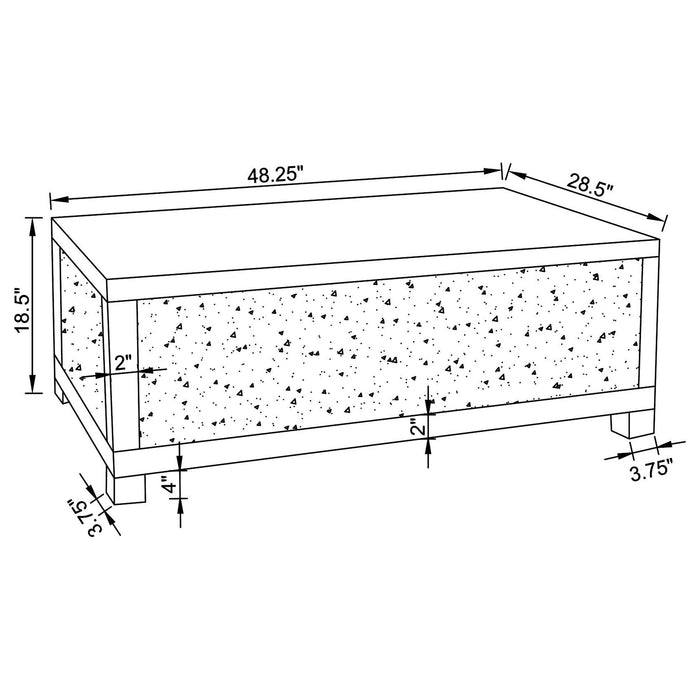 This glam mirrored coffee table set with a 48-inch rectangular coffee table and 20-inch square end table, combining style with practicality. Pieces feature engineered wood frames, fully mirrored surfaces, and dazzling acrylic crystal accents. The sleek designs and reflective finishes add light, dimension, and a luxurious glam vibe to contemporary interiors.