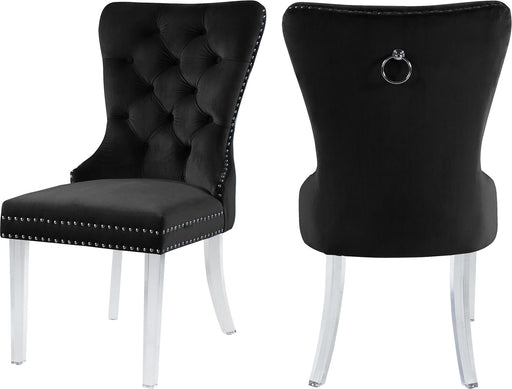 Dine in luxurious style with the Miley black velvet dining chair. Featuring a curved high back, plush cushioned seat and deep tufted black velvet u...