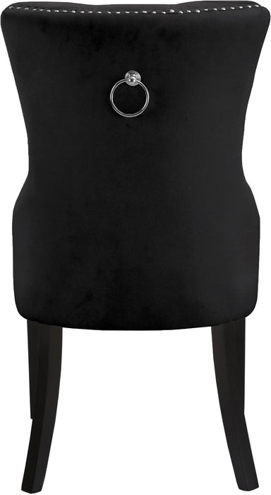 Dine in luxurious style with the Nikki black velvet dining chair. Featuring a curved high back, plush cushioned seat and deep tufted black velvet upholstery studded with chrome nailheads, this dining chair is sure to take your dining experience to a whole new level. Espresso wood legs provide sturdy support and complement the stunning black upholstery for a sleek, contemporary design.