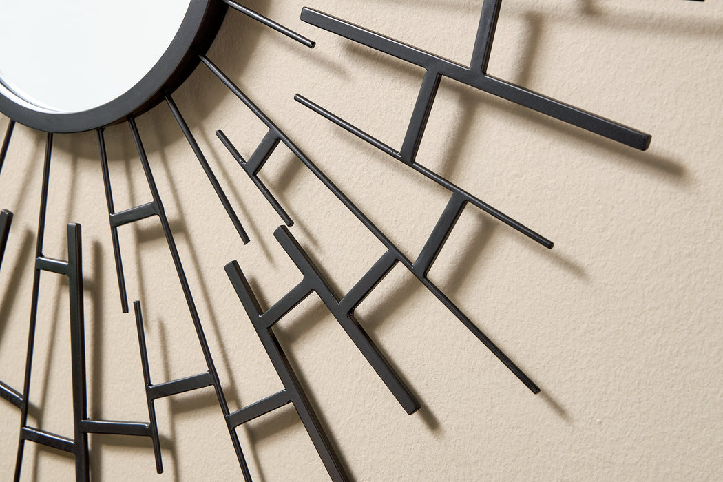 This accent mirror makes a bold statement in contemporary and industrial spaces. Framed with sunburst-style metal fretwork and finished in a luxe black, it's a fabulous blend of form and function.
